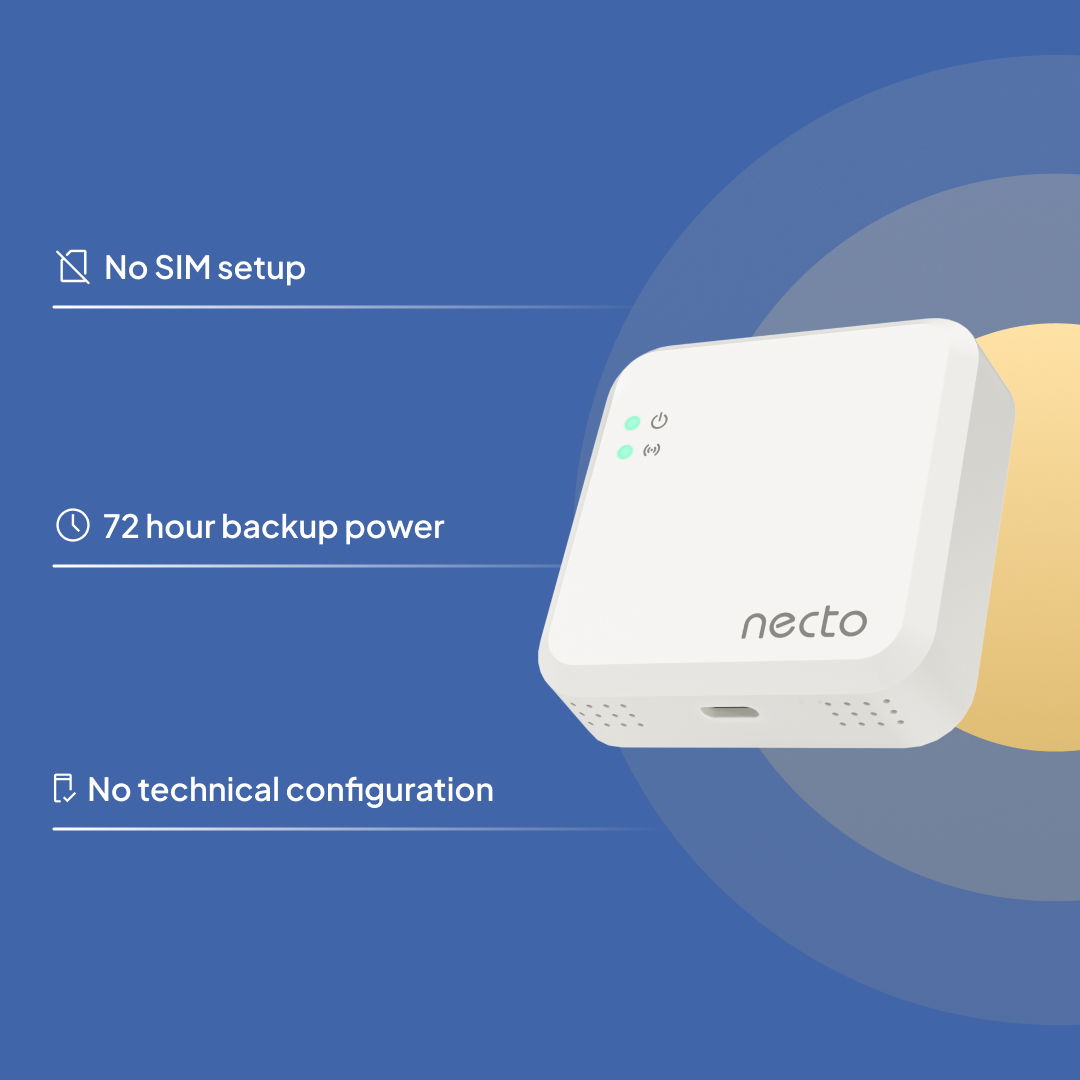 Download the Necto app and register your device. It connects automatically to the cellular network.