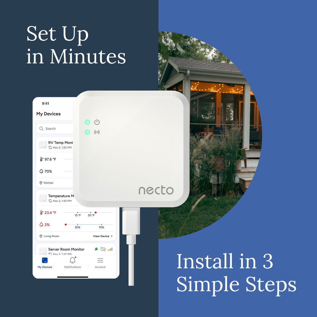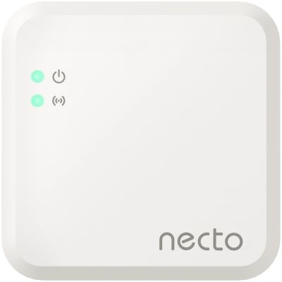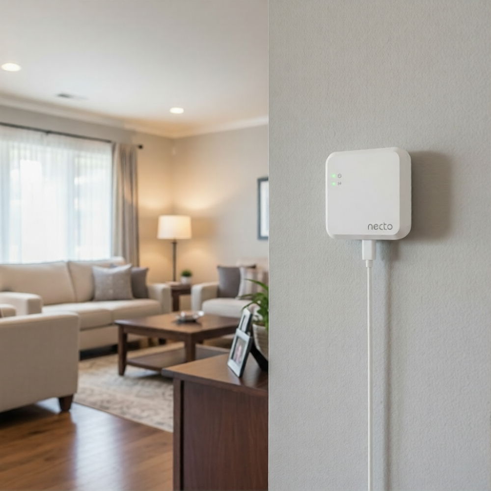 Plug Necto into any standard wall outlet and mount it easily using the included adhesive.