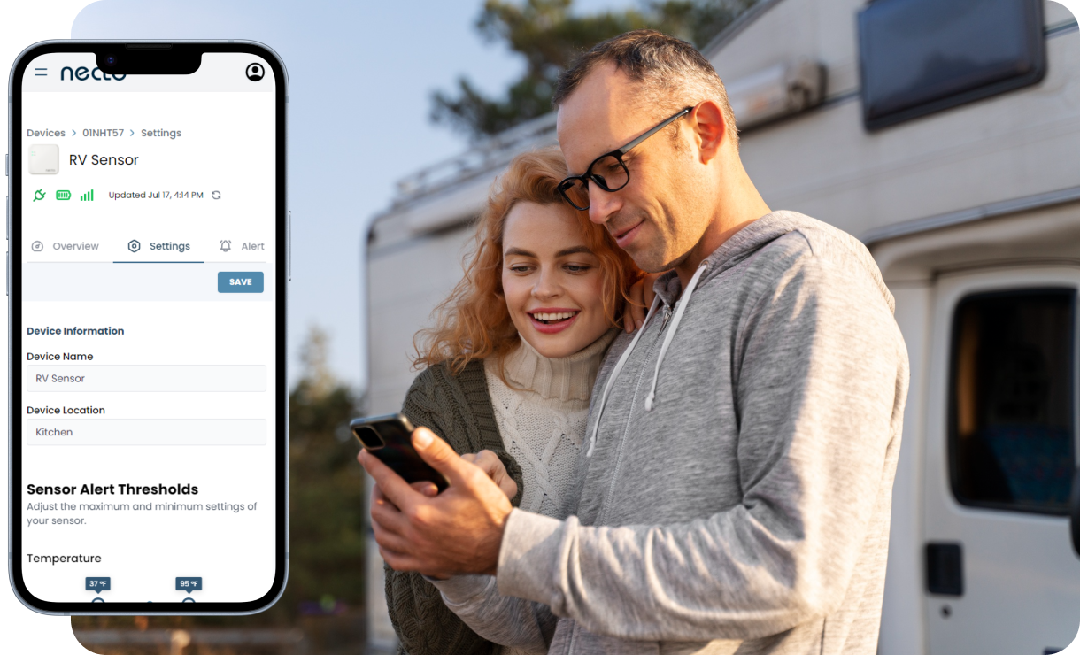 Our Pet Monitor is equipped with built-in temperature, humidity, and power loss sensors that monitor conditions inside your RV every second, 24/7.